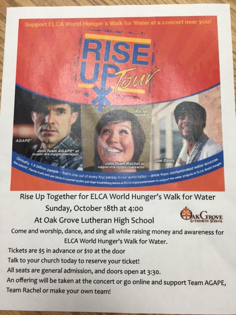 Join us THIS SUNDAY for an amazing concert from Rachel Kurtz and AGAPE* who were both at the Youth Gathering in Detroit this summer! If you are interested in going, let Kathy or Ashley know by noon on Thursday to purchase your ticket for $5. Otherwise tickets will be $10 at the door. We hope to see you at Oak Grove at 4pm for the concert!